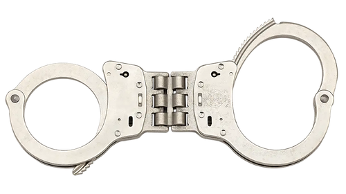 Over-sized leg irons featuring a 14" high-security heat-treated chain with elliptically contoured satin nickel cuffs. Fabricated from carbon steel with heat-treated internal lockworks, smooth ratchets for swift application, and double locks to prevent tampering. Meets or exceeds U.S. National Institute of Justice standards for workmanship, strength, corrosion, and tamper resistance.