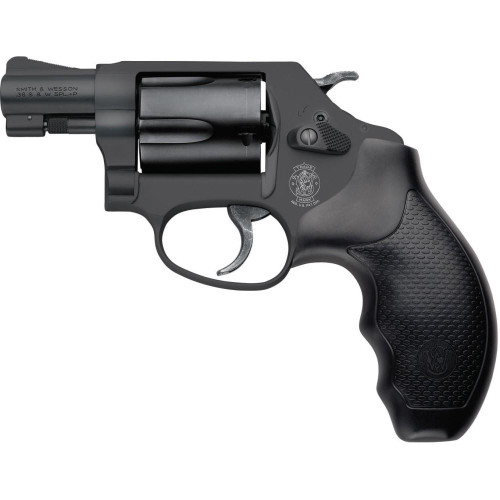 Smith & Wesson J-Frame Model 442 revolver chambered in .38 Special with a 1.875" barrel and 5-round capacity. This lightweight aluminum alloy revolver features fixed sights, black oxide finish, and engraved wood grips. Designed as a reliable, easy-to-use small-frame defense revolver with a proven design dating back to 1950.