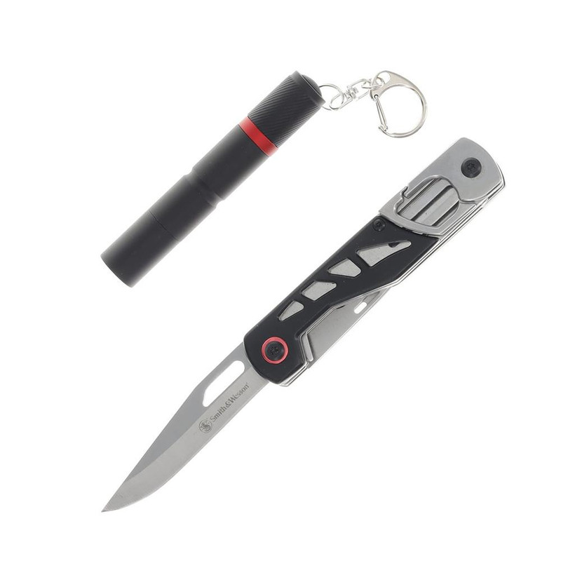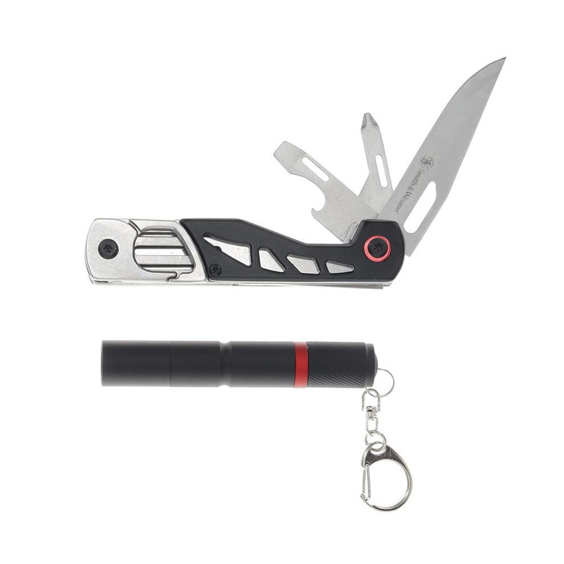 This Smith & Wesson multitool combines a 3" stainless steel folding knife with a keychain flashlight in a compact 4" closed design. The tool includes multiple implements such as a Phillips screwdriver and is built to Smith & Wesson's rugged standards for everyday carry and EDC use. Overall length extends to 6.75" when fully deployed.