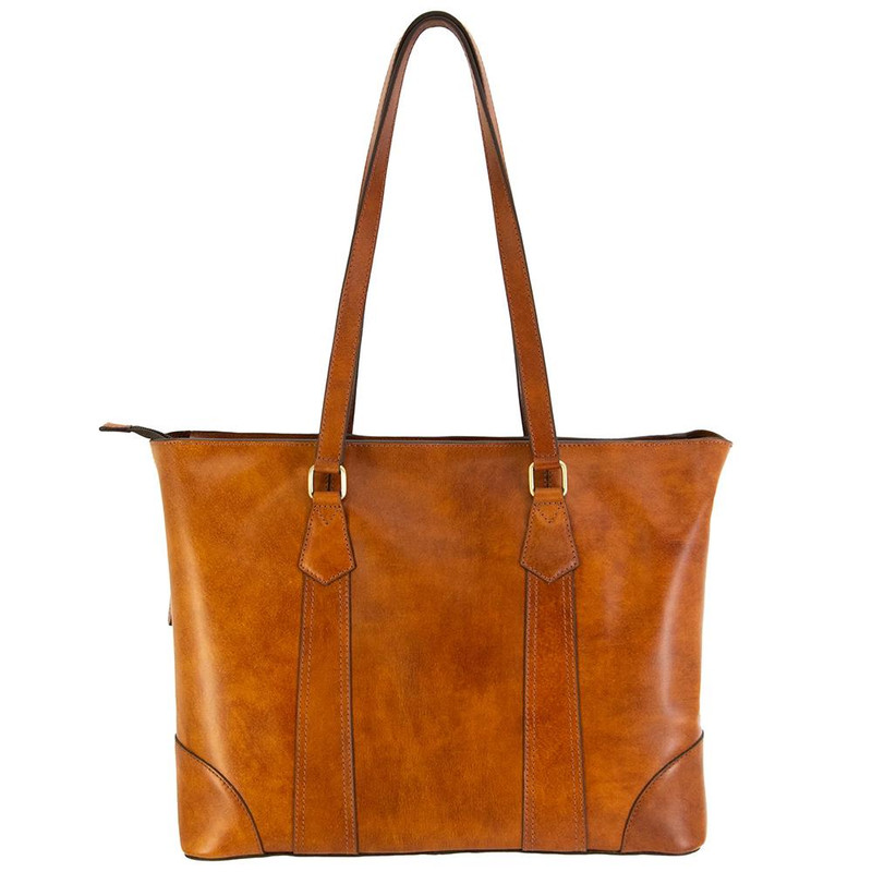 This pull-up leather concealed carry tote features a tan color with antiqued metal hardware and dimensions of 17.25" x 6" x 12.25". The bag includes four interior pockets with a large zippered main compartment containing two open phone pockets and additional zippered storage, making it suitable for everyday carry and commute use.
