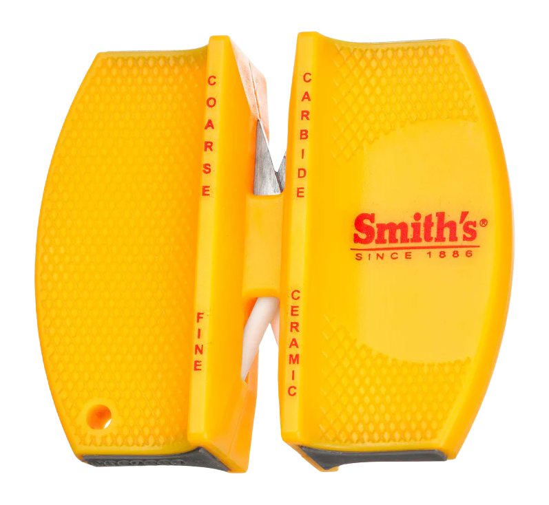 This two-step knife sharpener from Smith's Consumer Products is designed for field maintenance and general-purpose knife sharpening. The compact design makes it suitable for hunting, fishing, and outdoor use. It features dual sharpening stages for efficient blade honing.