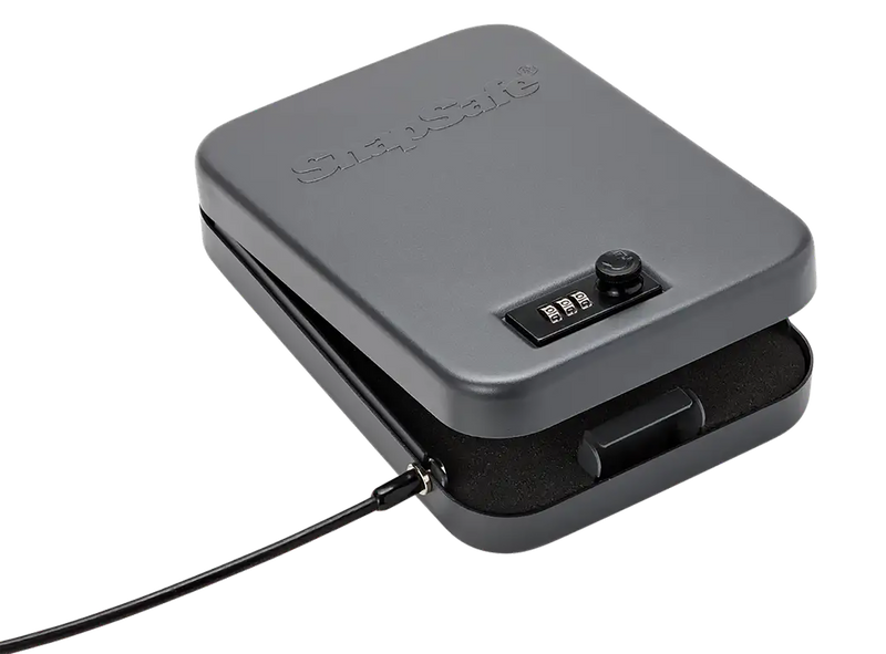 The SnapSafe Lock Box XL is a compact safe designed for secure storage of handguns and valuables at home, in vehicles, or while traveling. It features a combination and key dual-entry system, 16-gauge steel construction with foam interior, and includes a heavy-duty steel cable for securing to stationary objects. Dimensions are 10" W x 7" H x 2" D with a fireproof rating.