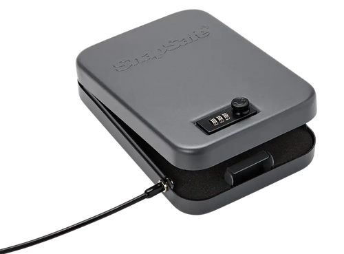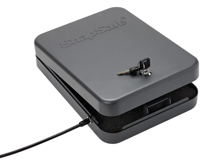 The SnapSafe Lock Box is a compact safe designed for secure storage of handguns and valuables at home, in vehicles, or while traveling. It features a key lock mechanism with two keys, 16 gauge steel construction, and includes a heavy steel cable for securing the box to stationary objects. Interior foam padding and fireproof construction protect contents, with dimensions of 11.5" x 8.5" x 2.5" and a weight of 6 lbs.