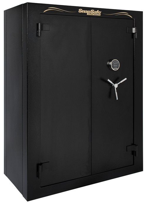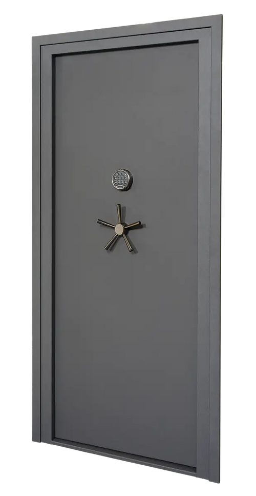 Heavy-duty 12 gauge steel vault door measuring 32.80"W x 81"H with in-swing configuration and black finish. Features dual-access security with both access code and key entry options. Weighs 330 lbs and is designed for secure firearm and valuables storage.