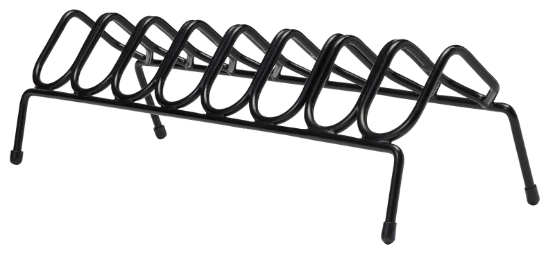 Black steel pistol rack designed to hold 8 handguns (pistols and/or revolvers) with a smooth finish and PVC coating that won't scratch firearm finishes. Measures 18.5" L x 7.5" W x 6.0" H and frees up space in gun safes, cabinets, or range use.