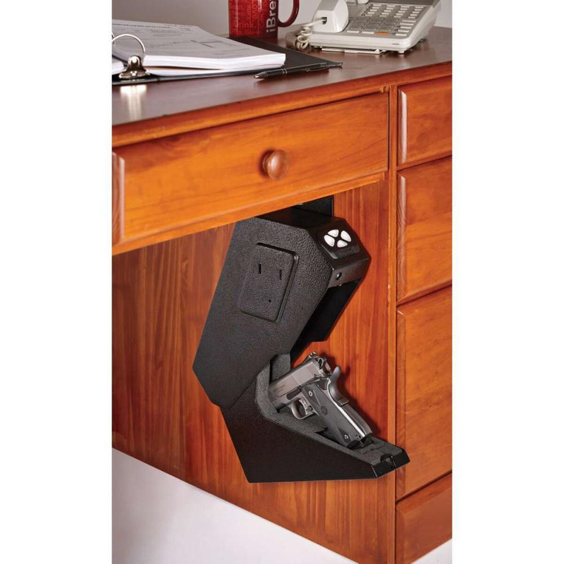 A compact, California DOJ-approved firearm storage device designed for quick access to handguns. Features a programmable 4 to 6 digit keypad code, tamper-resistant drop-down door, and protective foam liner. Mounts under counters, desks, or on nightstands for secure storage with rapid deployment capability.