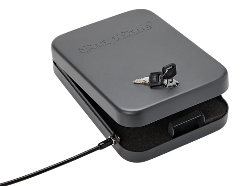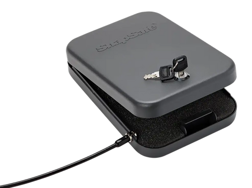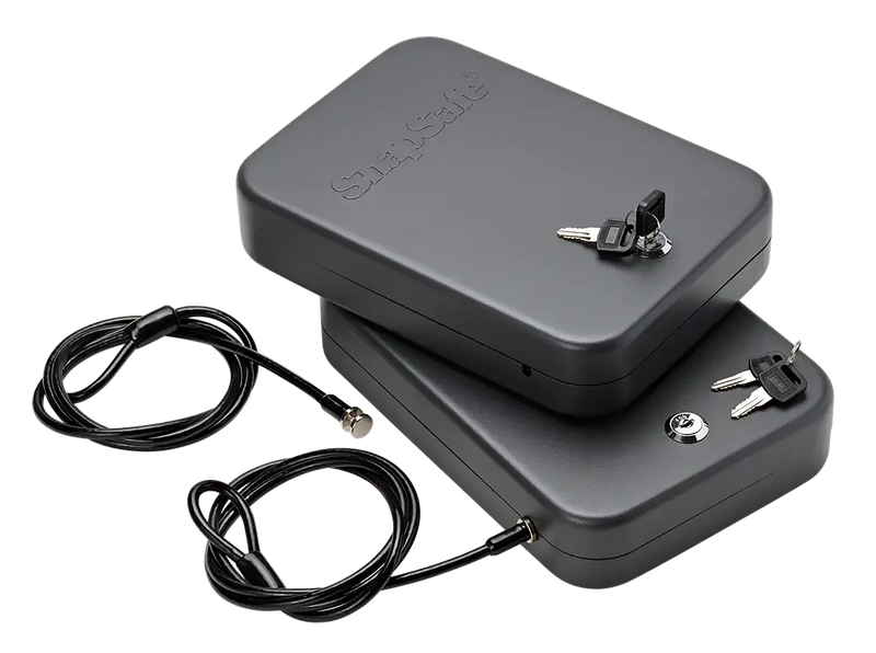 This 2-pack of SnapSafe lock boxes provides secure storage for handguns and valuables in multiple locations such as home, vehicle, or while traveling. Each box measures 10" x 7" x 2" with 16 gauge steel construction and includes foam interior, heavy-duty cable for securing to stationary objects, and four keys (all unlock both boxes). The fireproof design offers additional protection for personal valuables and is suitable for concealed carry permit holders.