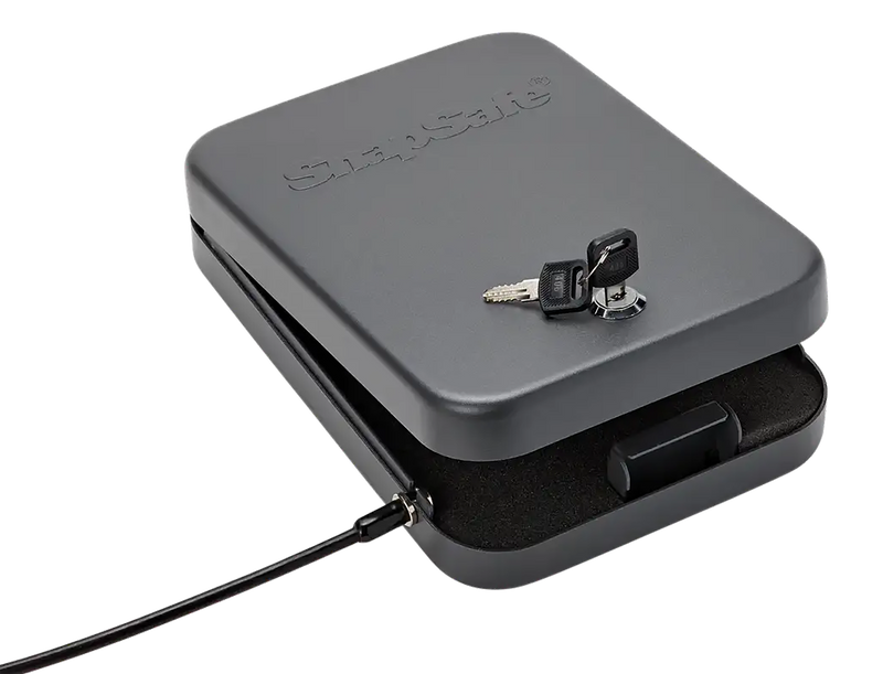 The SnapSafe Lock Box XL is a compact pistol safe designed for secure storage of handguns and valuables at home, in vehicles, or while traveling. It features a key-entry lock mechanism, 16-gauge steel construction with foam interior, and includes a heavy-duty steel cable for securing to stationary objects. Dimensions are 10" W x 7" H x 2" D with a 6 lb weight.