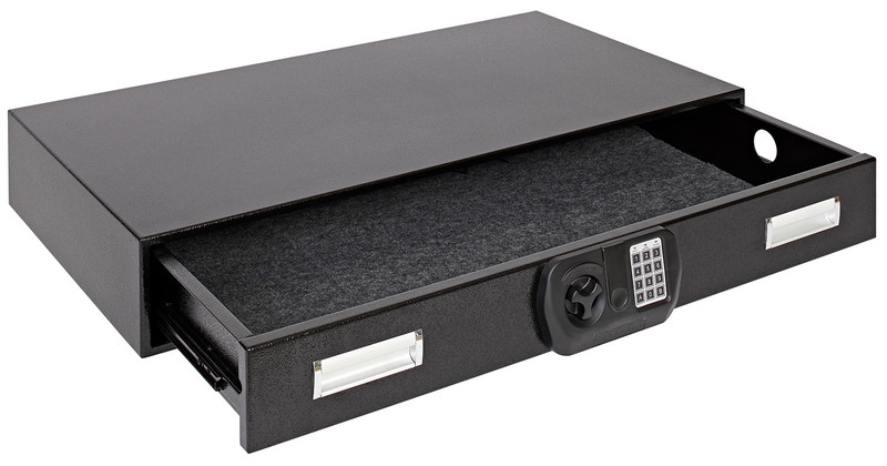 A 14-gauge steel under-bed safe designed for secure storage of firearms, jewelry, documents, and valuables. Features a digital lock with 3 to 8-digit programmable code, key backup, pry-resistant door, and includes a 5-foot cable for anchoring to stationary objects. Weighs 105 lbs and accommodates a slide-out drawer for easy access.