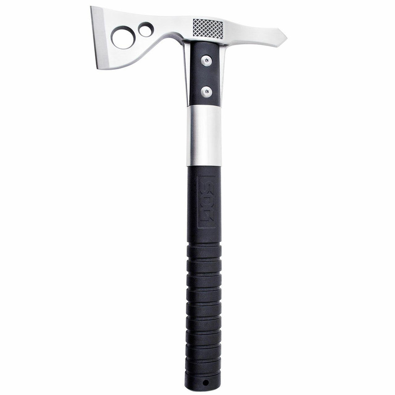 The SOG FastHawk is a lightweight, versatile axe head made of 420 stainless steel with a hard-cased black coating mounted to a glass-filled nylon handle. At 12.5" overall length with a 2" blade, it is designed for multiple tasks including chopping, cutting, hammering, prying, digging, and throwing. Includes a ballistic nylon sheath and comes with a manufacturer lifetime warranty.