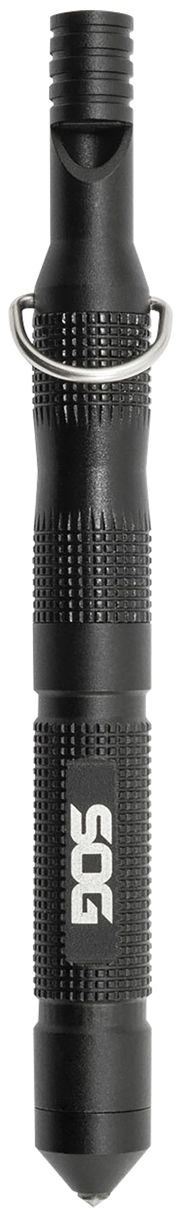 The SOG Flint is a compact 4.3-inch survival tool weighing less than an ounce, featuring a built-in fire starter, steel wool tinder compartment, carbide-tipped glass breaker, and safety whistle. Designed for emergency preparedness and survival situations, it's small enough to carry on a lanyard, in a pocket, or pack. The black anodized aluminum construction provides durability in a pencil-sized package.