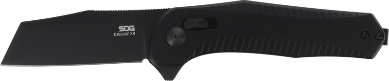 The SOG Diverge XR is a 3-inch everyday carry folding knife featuring a sheepsfoot-style blade forged from D2 steel with a PVD black finish. The blade is 2.4mm thick and pairs with an anodized 6061AL aluminum handle that has a textured grip and ambidextrous thumb studs for reliable operation. Overall length when open is 7.5 inches, weighs 2.8 oz, and includes a flipper opening mechanism with XR lock type.