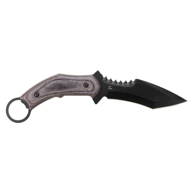 This SOG Phantom Edge is a fixed blade knife featuring a 4-3/4" tanto blade made from 420 stainless steel with a black oxide finish and built-in saw back edge. The knife has a wooden handle with grey coloring, weighs 8.6 oz, and comes with a nylon sheath for carry and storage.