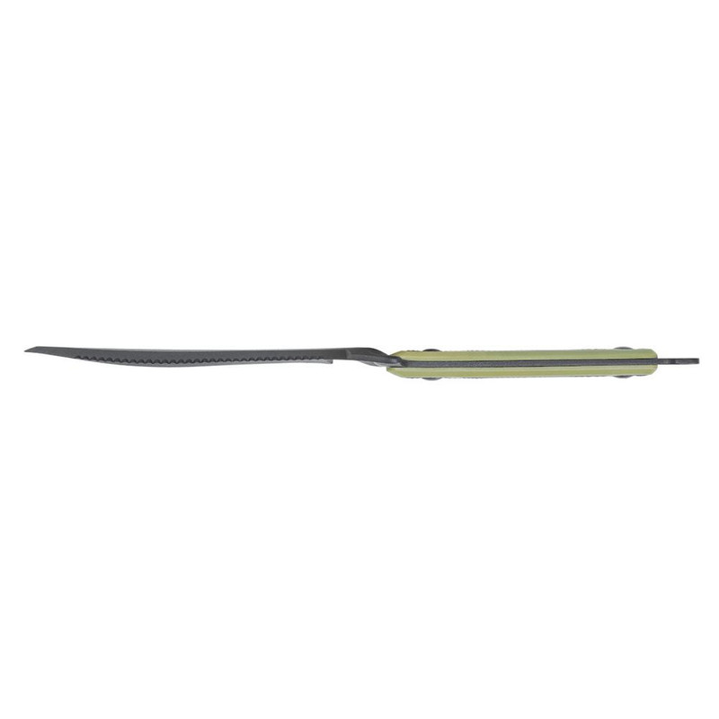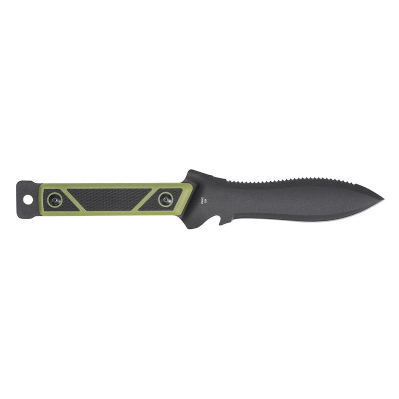A versatile fixed blade knife featuring a 6.5" 420 stainless steel spear point blade with powder-coat finish and plain edge with saw-back serrations. The full-tang blade includes a concave profile for digging tasks and an integrated cord cutter, paired with a textured polypropylene handle for secure grip in wet or dry conditions.