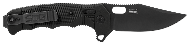 A hard-use folding knife made entirely in the USA, featuring SOG's first MagnaCut steel blade known for superior edge retention, corrosion resistance, and durability. The Seal XR offers a 3.9" clip point blade with a black cerakote finish and titanium liners combined with black textured glass-reinforced nylon handle scales. This large-format pocket knife is designed and optimized in consultation with professional users and includes a lifetime manufacturer warranty.