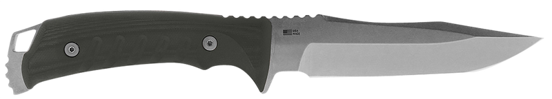 USA-made fixed blade knife featuring a CPM S35VN stainless steel blade with stonewashed finish and full tang construction. The black canvas Micarta handle provides a secure grip, paired with an adjustable low-profile Kydex sheath for carry and storage. Designed for general-purpose cutting tasks with excellent edge retention and corrosion resistance.