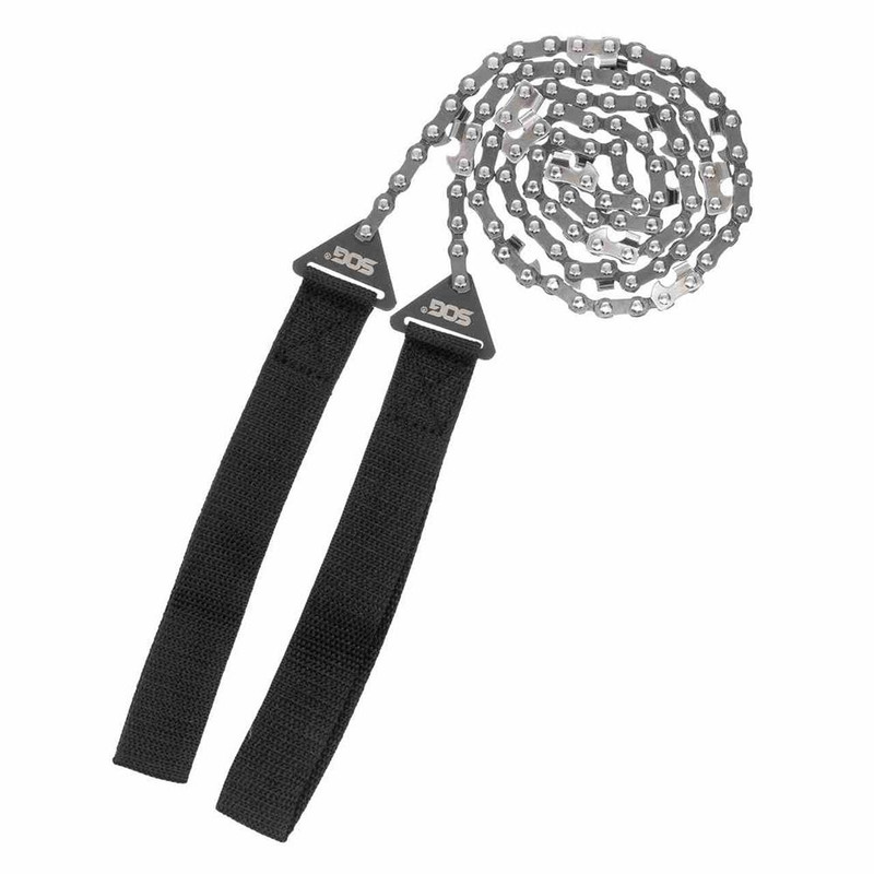 A 36" high-carbon steel chainsaw with bi-directional cutting teeth designed for outdoor survival and emergency use. Features heavy-duty nylon wrist handles for a secure grip and comes with a nylon carry case for storage and transport. Lightweight and compact for portability.