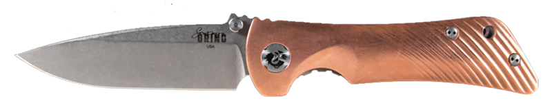 The Spider Monkey is a compact folding knife featuring a 3.25" drop point blade made from S35VN stainless steel with a satin finish. The knife has a titanium and copper textured handle, thumb stud opening mechanism, and includes a pocket clip for convenient carry. With an overall length of 7.44" when open and weighing 3.20 oz, it's designed as a lightweight everyday carry option.