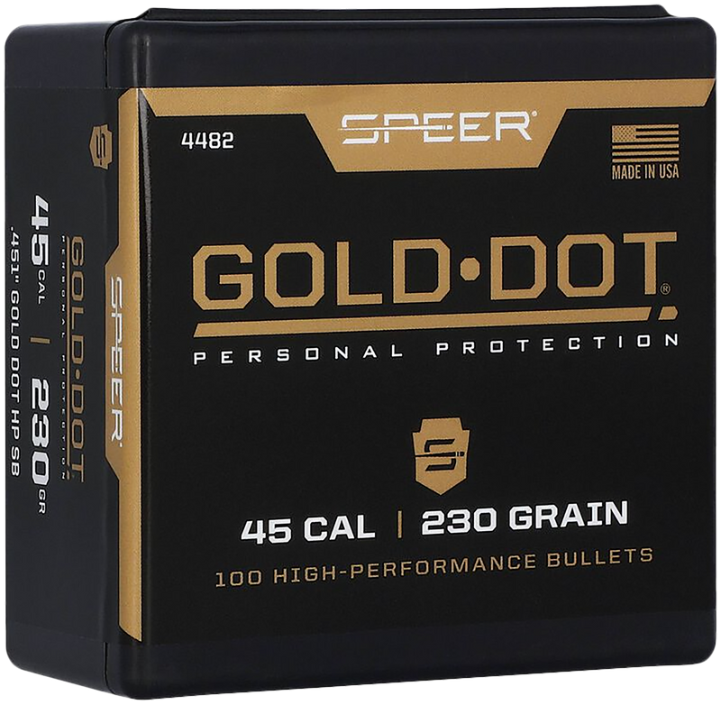 Speer Gold Dot Personal Protection bullets are .451 diameter, 230 grain hollow point projectiles designed for handgun reloading. These bullets feature a lead core with lead jacket and are intended for personal protection applications. Sold in boxes of 100 rounds with a sectional density of .162.