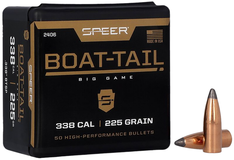 Speer Boat-Tail rifle bullets in .338 caliber with 225 grain weight, featuring a spitzer boat tail soft point design optimized for hunting applications. These jacketed lead bullets are manufactured for consistency, dependability, and accuracy across a wide range of shooting scenarios. Sold in boxes of 50 rounds and designed for reloaders seeking quality components.