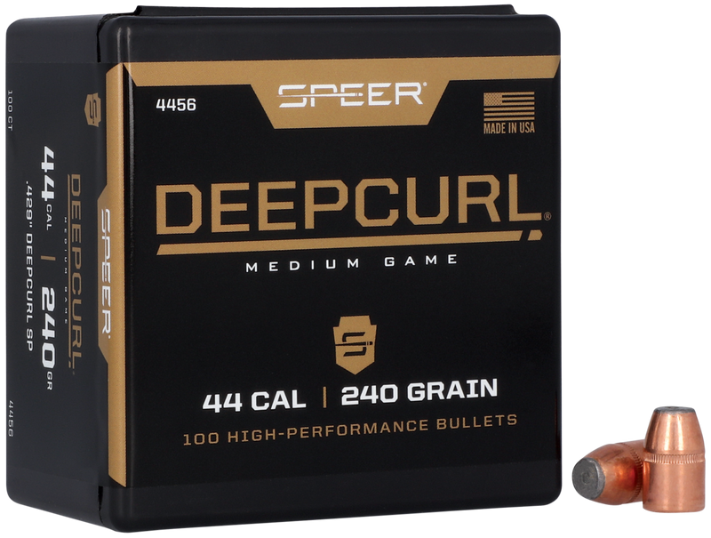 Speer Deep Curl bullets feature an electrochemically bonded jacket to lead core construction designed for reliable controlled expansion in handgun hunting applications. The .429 caliber, 240 grain soft point configuration offers high weight retention and deep penetration on heavy-bodied game. Each box contains 100 bullets with pre-formed petals and a cannelure for consistent reloading performance.