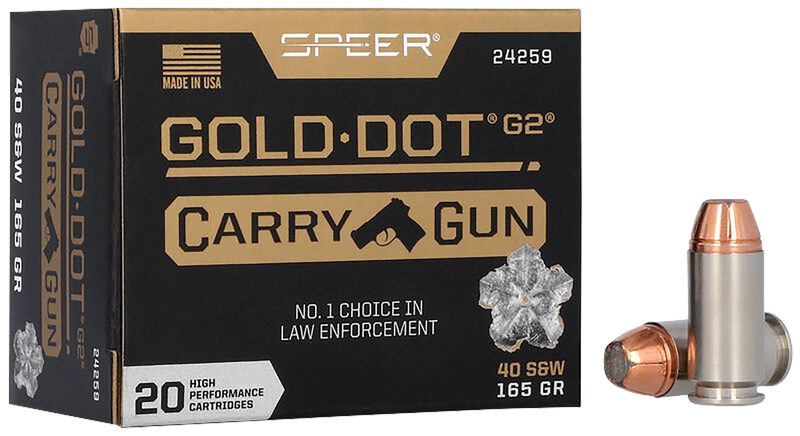 Speer Gold Dot Carry Gun ammunition in .40 S&W with 165 grain hollow point bullets designed for compact pistols. This law enforcement-trusted ammunition delivers 1150 fps muzzle velocity and 484 ft-lbs of energy with consistent penetration and expansion. Loaded in nickel-plated brass cases, boxer primed and reloadable, this 20-round box is optimized for home and personal defense applications.
