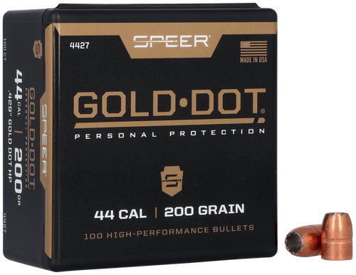 Speer Gold Dot .44 S&W Special ammunition features 200-grain hollow-point bullets loaded to 875 fps muzzle velocity with 340 ft-lbs of energy. These rounds are designed for personal protection and home defense, delivering consistent expansion and penetration through common barriers. Packaged 20 rounds per box with nickel-plated brass cases.