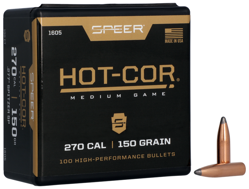 Speer Hot-Cor reloading bullets in .277 caliber (270 Winchester) with 150-grain weight and spitzer soft point design. The Hot-Cor construction process pours molten lead into the copper jacket to maximize consistency and minimize shooter cost. Designed for accurate, flat-shooting performance on medium and big game with reliable terminal performance.