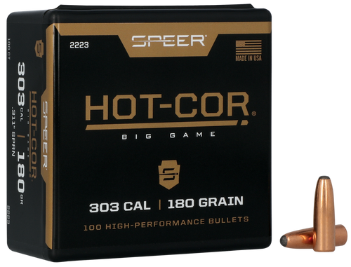 Speer Hot-Cor rifle bullets feature a proprietary manufacturing process where molten lead is poured directly into the jacket for superior consistency and accuracy. These .311" diameter, 150 grain semi-spitzer soft point bullets are designed for .303 caliber rifles and come in a box of 100 rounds. Ideal for hunters and reloaders seeking premium jacketed lead projectiles across a wide range of rifle calibers.