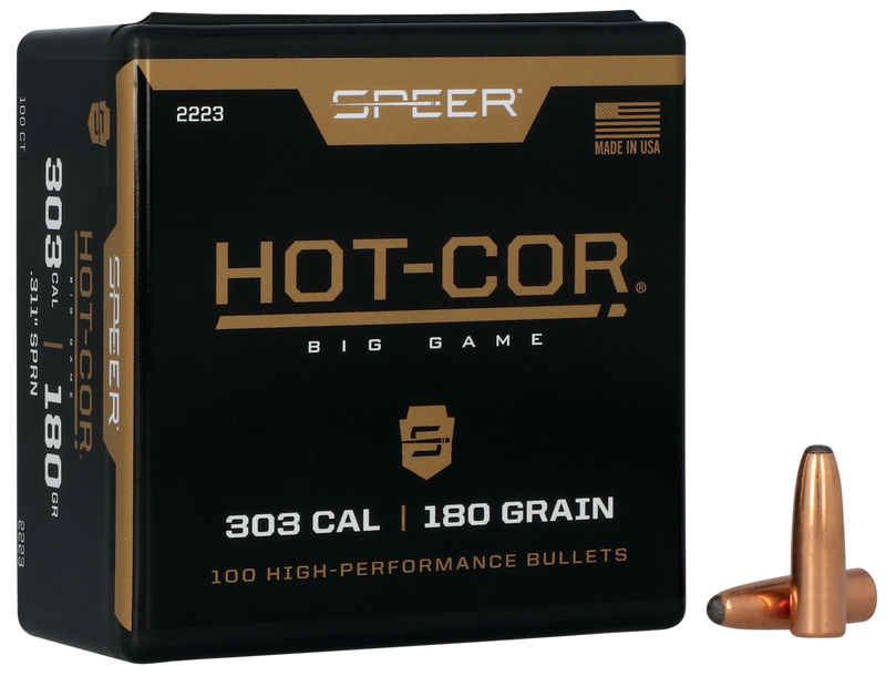 Speer Hot-Cor .303 caliber rifle bullets feature a 180 grain soft point round nose design manufactured using Speer's Hot-Cor process, which pours molten lead directly into the copper jacket for superior consistency. These jacketed lead bullets have a .311" diameter and 1.060" overall length, designed for hunting applications. Sold in boxes of 100 rounds.