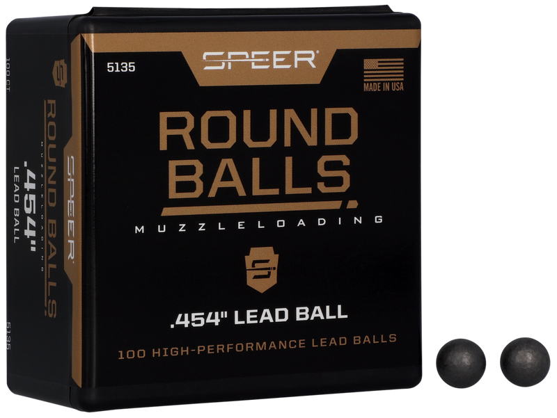 Speer lead round balls are swaged from pure lead using a special process to ensure maximum uniformity without voids or air pockets. These .454" diameter balls weigh 140 grains and are designed for .44 caliber muzzleloading rifles. Each box contains 100 balls with a smooth, round surface for improved rotation and consistent accuracy.