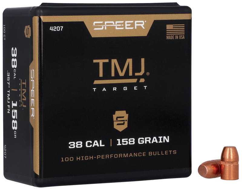 Speer TMJ handgun bullets feature Total Metal Jacket construction with Uni-Cor technology, where molten lead is poured directly into the copper jacket to completely encase the lead core. These .357" diameter, 158 grain bullets are designed for .38 Special and .357 Magnum handguns and come in boxes of 100. The cannelured design and lead core with copper jacket make them suitable for target shooting applications.