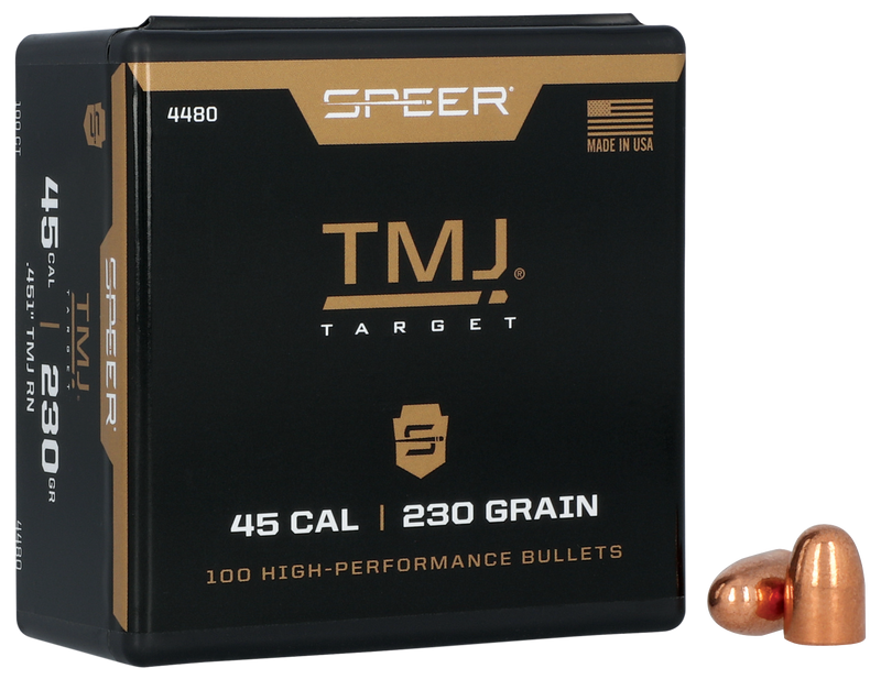 Speer TMJ .45 caliber bullets feature Total Metal Jacket construction with Uni-Cor technology, where molten lead is poured directly into the copper jacket to prevent deformation under pressure. These 230 grain bullets are designed for target shooting and handgun reloading, offered in boxes of 100 rounds per unit.