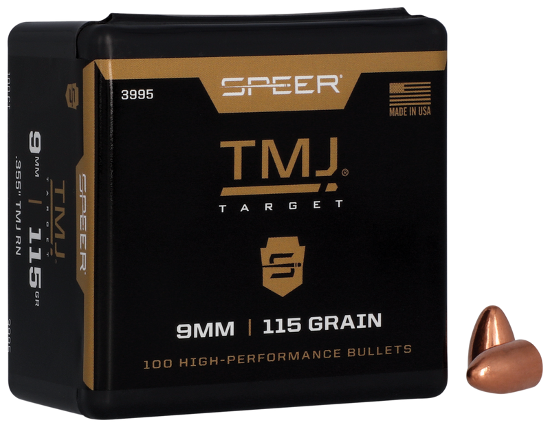 Speer TMJ bullets feature Uni-Cor technology that completely encases the lead core in a seamless copper jacket, eliminating exposed lead at the base. These .355" diameter, 115 grain Total Metal Jacket rounds are designed for target shooting and handgun reloading, offering improved accuracy and consistency while reducing fouling and airborne lead. Packaged with 100 rounds per box.