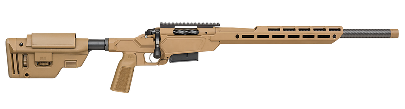 The Springfield Armory 2020 Heatseeker is a bolt-action rifle chambered in 6.5 Creedmoor with a 20" carbon fiber threaded barrel and 1:8 twist rate. Built on a stainless steel receiver with a Sharps Bros. Heatseeker M-Lok chassis, it features a B5 Systems collapsible precision stock, TriggerTech adjustable trigger, and Picatinny optic mount. The rifle weighs 7.1-7.7 lbs and is finished in Coyote Brown Cerakote with suppressor-ready threading.