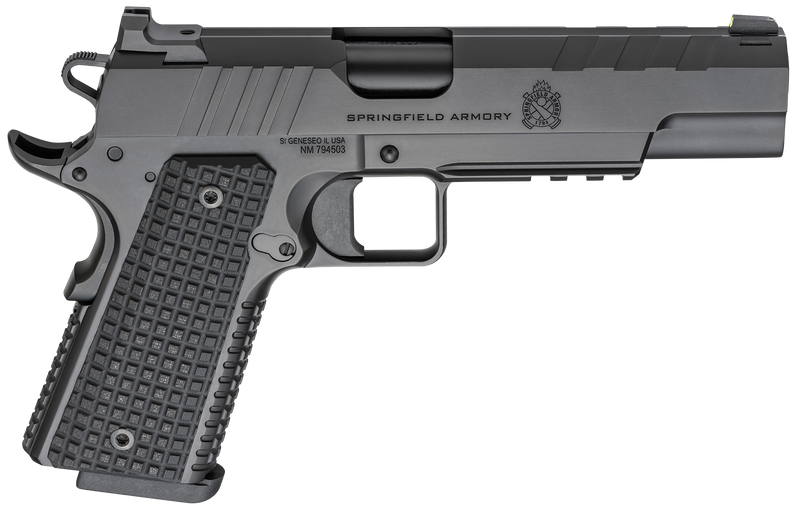 The Springfield Emissary is a 9mm semi-automatic 1911-style pistol featuring a 5" match-grade bull barrel with a tri-top slide cut and 40 LPI serrations. It comes equipped with tritium night sights, VZ G10 grips, manual thumb safety, and a Cerakote black finish on a forged steel frame and slide for reliability and reduced muzzle flip.