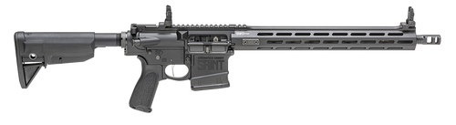 Semi-automatic AR-platform rifle chambered in .308 Winchester with a 16" lightweight barrel and 1:10 twist rate. Features a free-floating M-LOK handguard, low-profile adjustable flip-up iron sights, ambidextrous safety, 4-prong flash hider, and B5 Systems collapsible stock. Weighs 7.11 lbs with an overall length range of 34.5" to 37.75".