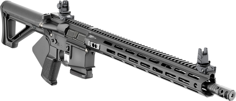 Semi-automatic AR-platform rifle chambered in 5.56 NATO with a 16" chrome moly vanadium barrel and 1-in-8 twist rate. Features a free-float M-LOK handguard, low-profile flip-up sights, Magpul MOE fixed carbine stock, and Strike Industries pistol grip. California compliant with 10+1 capacity, weighs approximately 6.12-6.87 lbs, and includes a SA 4-prong flash hider.