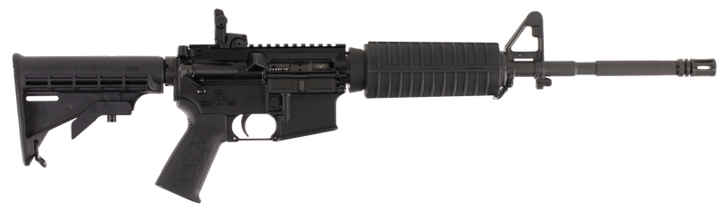 Semi-auto rifle chambered in 5.56 NATO/.223 Rem with a 16" threaded barrel and 1:7" twist rate. Features A2 flash hider, A2 front sight with Magpul MBUS rear sight, Mil-Spec trigger, and Spikes Tactical M4 stock with 6-position adjustment. Weighs 6.05 lbs and ships without magazine.