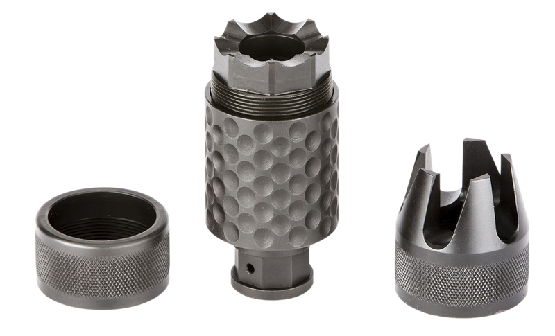 The Barking Spider2 is a muzzle brake designed for 5.56 NATO rifles with AR-15 compatibility and 1/2"-28 tpi threading. Constructed from 4140 chromoly steel with black nitride finish, it measures 3.75" in overall length and 1.40" in diameter. This brake reduces recoil and muzzle rise through strategic porting.