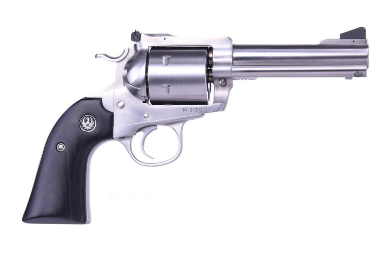 Single-action revolver chambered in 44 Magnum/44 Special with a 4-5/8" stainless steel barrel and 6-round capacity. Features a Bisley-style grip, hammer, and trigger with adjustable rear and pinned front black ramp sights. Weighs 45 oz with black laminate grips and an un-fluted cylinder.