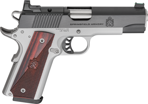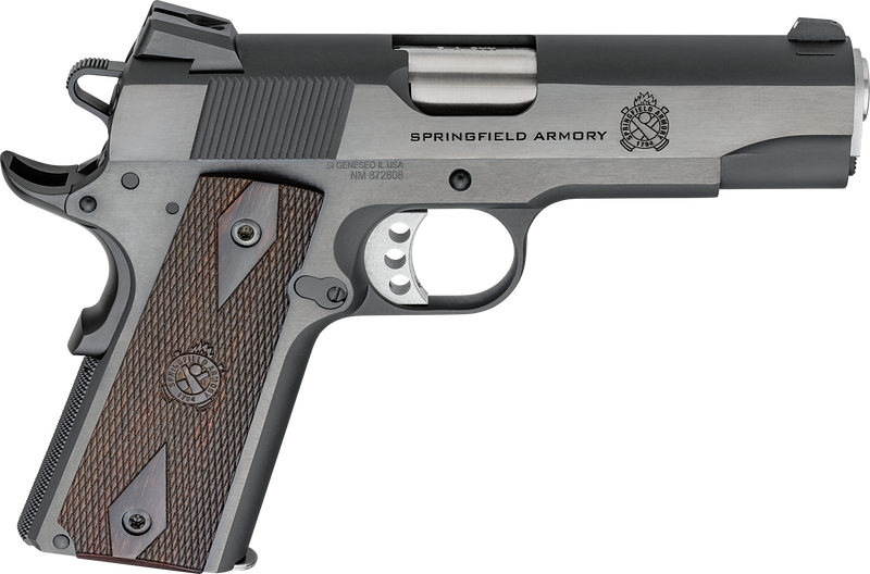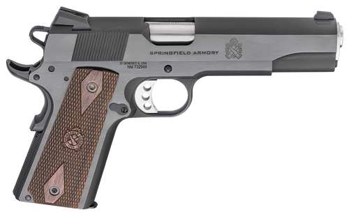 The Springfield Armory 1911 Garrison is a semi-automatic, single-action pistol chambered in 9mm Luger with a 4.25" match-grade barrel and 9+1 capacity. This commander-size 1911 features a blued carbon steel slide and frame, low-profile 3-dot combat sights, skeletonized hammer, extended beavertail grip safety, and thinline wood grips. Weighing 34 oz with an overall length of 7.9", it combines classic 1911 ergonomics with modern refinements.