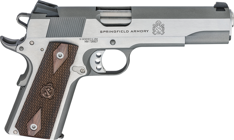 The Springfield Armory 1911 Garrison is a single-action semi-automatic pistol chambered in 9mm Luger with a 5" forged stainless steel match-grade barrel and low-profile combat 3-dot sights. It features a stainless steel slide and frame, thin-line wood grips, GI-style recoil system, and manual thumb safety with grip safety, holding 9+1 rounds. The pistol weighs 38 oz with an overall length of 8.6".