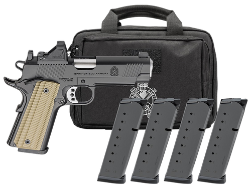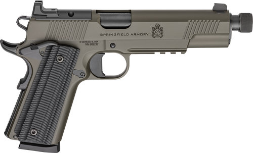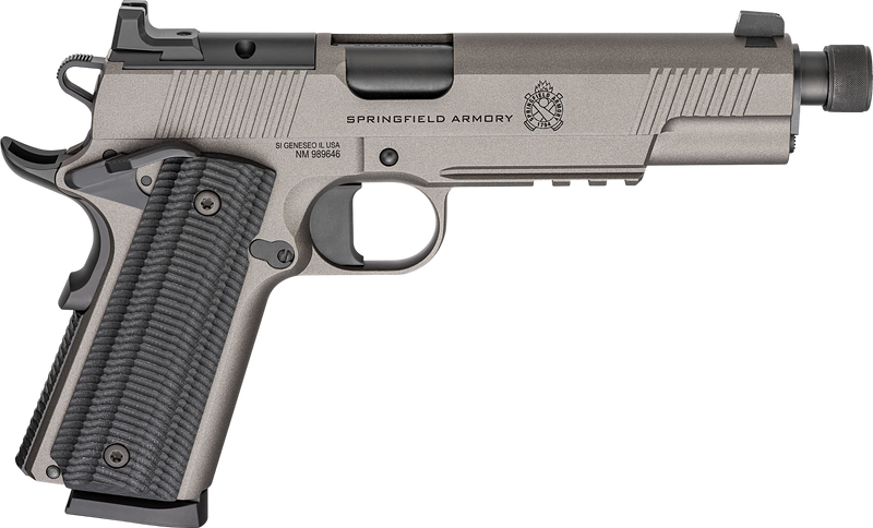 The Springfield 1911 Operator AOS is a single-action semi-automatic pistol chambered in .45 ACP with a 5.75" match-grade threaded barrel and optics-ready slide supporting popular red dot systems. Features include VZ G10 grips, ambidextrous thumb safety, tritium night sights with serrated rear sight, integral Picatinny rail, and comes with two 8-round magazines. This full-size steel frame handgun weighs 42 oz. and measures 8.6" overall length with a Tungsten Gray Cerakote finish.
