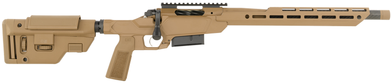 The Springfield Armory Model 2020 Heatseeker is a bolt-action rifle chambered in .308 Winchester with a 16" carbon fiber threaded barrel and 5+1 capacity. Built on a dual-locking-lug Model 2020 action with a Sharps Bros. Heatseeker Chassis in Coyote Brown Cerakote, it features a B5 Systems Collapsible Precision Stock, TriggerTech adjustable trigger, and Picatinny mounting for optics. The rifle weighs approximately 7.7 lbs and measures 35.5" overall length.