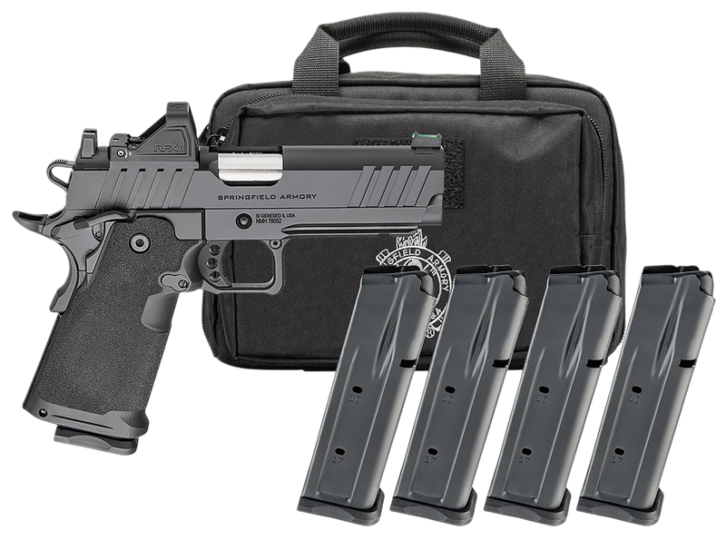 Semi-automatic single-action 1911 pistol chambered in 9mm Luger with a 4.25" forged stainless steel bull barrel and 10+1 round capacity. Features an optics-ready slide with ambidextrous safety, fiber optic front sight, black serrated rear sight, and includes a factory-installed Viridian RFX11 green dot optic. Gear Pac package includes 4 magazines, heavy-duty nylon range bag, and weighs 32.5 oz.