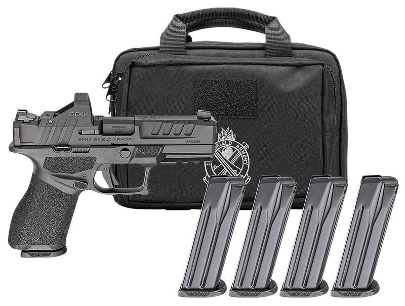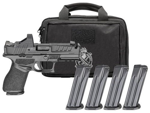 Semi-automatic striker-fired compact pistol in 9mm Luger with a 4-inch barrel and 10+1 capacity. Features an optics-ready slide with fixed white dot front and tactical rack U-dot rear sights, complemented by a factory-installed Viridian RFX11 green dot optic. Includes polymer frame, black adaptive grip texture, four 10-round magazines, and Springfield range bag; California compliant.