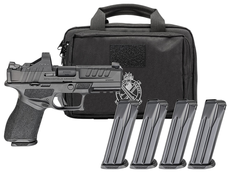 The Springfield Echelon 4.0C is a striker-fired, semi-automatic compact pistol chambered in 9mm Luger with a 4" hammer-forged barrel and optics-ready slide. This Gear Pac includes a factory-installed Viridian RFX11 green dot optic, four magazines (one 15-round and three 18-round), a range bag, and weighs 24 oz. Fixed white-dot front and tactical rack U-dot rear sights are standard, with an overall length of 7.25" and black polymer frame.