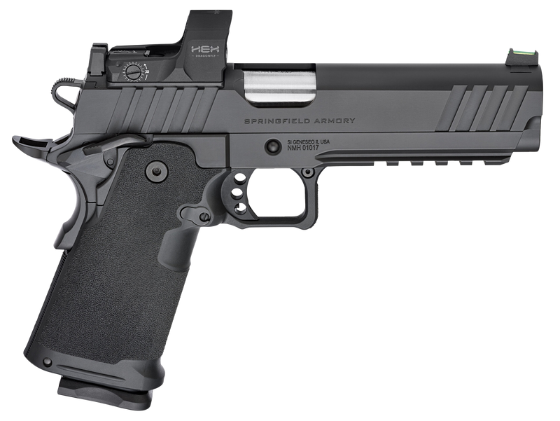 The Springfield Armory Prodigy is a 9mm semi-automatic pistol with a 5" barrel and double-stack magazine capacity of 20+1 or 17+1 rounds. It features an optics-ready serrated slide, ambidextrous safety, fiber optic front sight, and comes bundled with a Hex Dragonfly red dot. The polymer grip module mounts to a forged steel frame for a modern take on the classic 1911 platform.