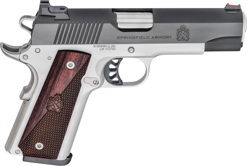Springfield Armory 1911 Ronin chambered in 45 ACP with single-action-only (SAO) operation and 4.25" stainless match-grade barrel. Features a salt-blued serrated carbon steel slide, satin Cerakote aluminum frame with beavertail grip safety, fiber optic front sight with tactical rear sight, and crossed cannon wood grips. Capacity is 8+1 rounds.